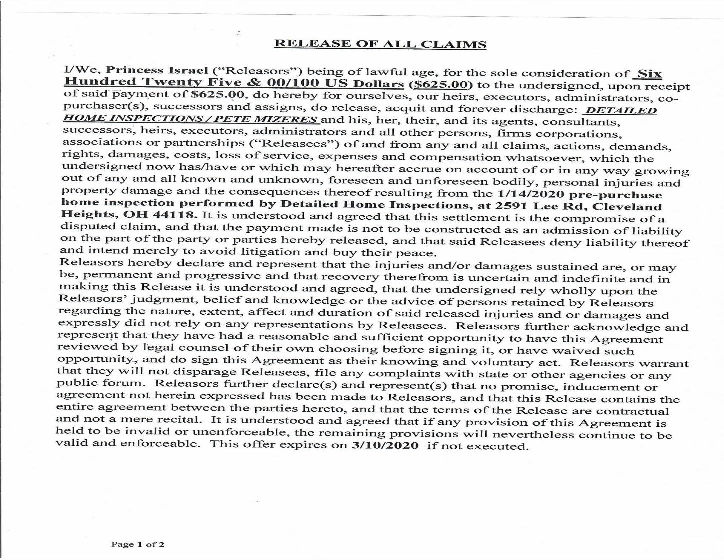 | I don't know if Detailed Inspection has changed their mutual release ,this is what was sent to me which I declined to sign. I agreed to remove the one star Google review but I was NOT going to agree to this @#@% Mutual Release. If you are requesting a refund speak to an attorney before signing. I posted a one star Google review with photos similar to what is on my website informing the public of the issues I allegedly encountered. Be Very Careful before you sign this MUTUAL RELEASE. |