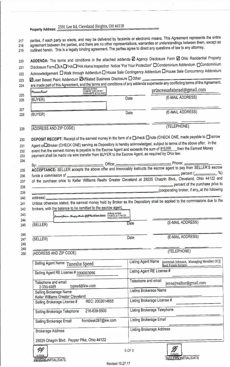 | Princess Ada Israel, Buyer, signed offer January 8,2020 @ 10:08 a.m. E.S.T. signed in the state of Arizona. Jeremiah Johnson, Part Owner,Managing Member of JJ Real Estate Solutions LLC, countered/signed offer January 8,2020 @ 3:17 p.m. E.S.T. Princess Ada Israel accepted offer January 8,2020 @ 5: 36 p.m E.S.T. Selling Agent Tanesha Speed real estate license current. Selling Brokerage Keller Williams Greater Cleveland real estate license current. Listing Agent Jeremiah Johnson no record on file then or ever Ohio Real Estate Commission license look up. JJ Real Estate Solutions no record on file with Ohio Real Estate Commission. Jenna Johnson, Listing Agent, who holds a current real estate license email was listed for contact. Agents and Brokerage email addresses are available to the public on the Internet. Jeremiah Johnson was not the listing Agent, nor is he a licensed Agent. Complaint filed with Ohio Real Estae Commission |