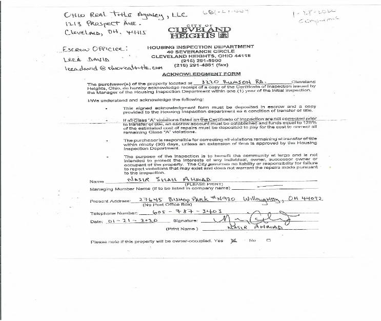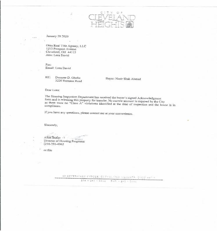 | Notice the city responded within a week. From January 8,2020 to February 13,2020 Fidelity had ample time to have this document returned. They could not because Princess would have walked away from the deal. How could Fidelity transfer the property ? Everyone is pointing fingers the city states it was escrow,escrow claims it was the Seller and Tanesha claims it was the Seller. All prospective Buyers falls on the Buyers Agent;s to have a copy sent over by the Seller or request one form housing. |