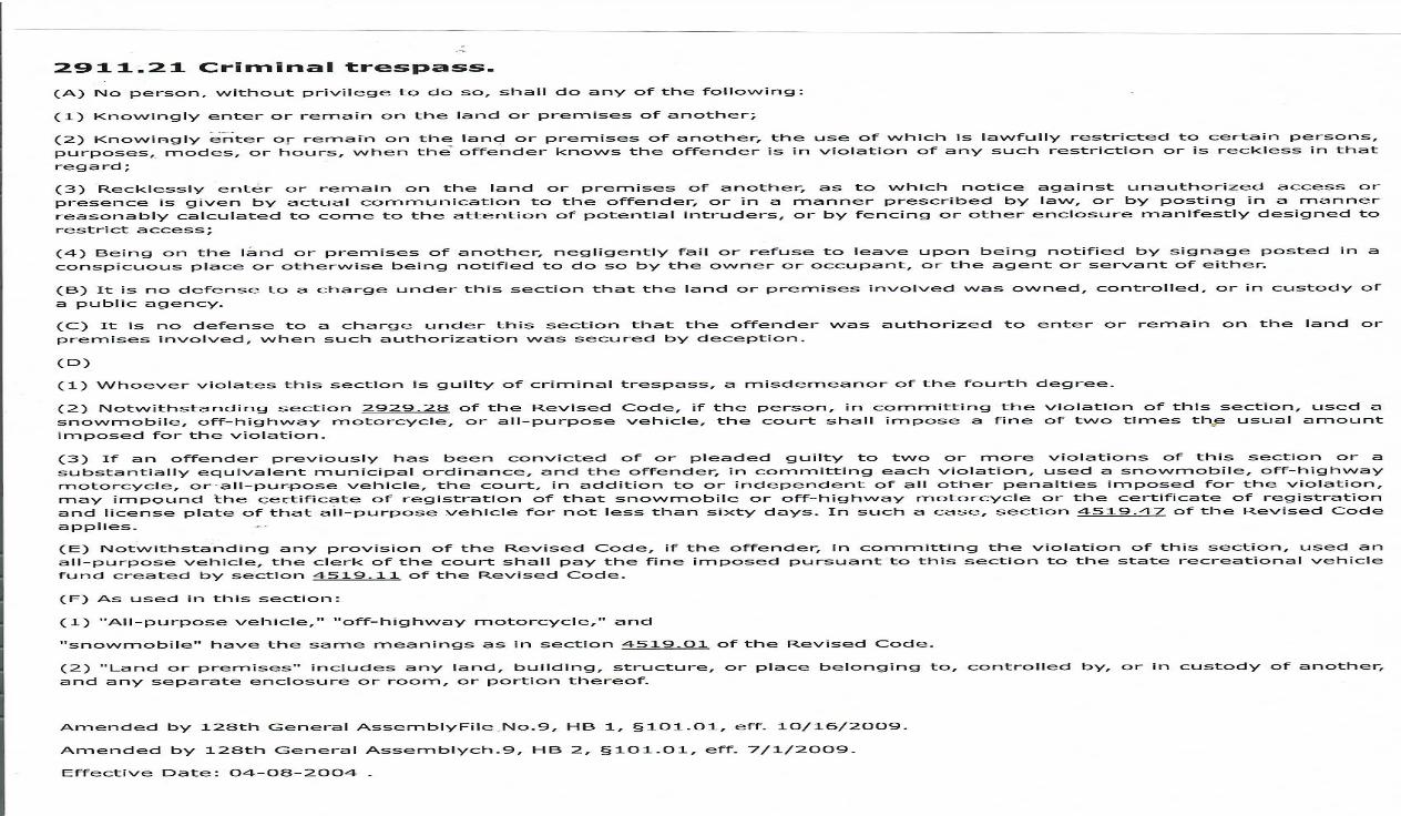 (ORC 2911.21) (d) In the case of land or premises which is vacant, a person who enters or remains on the land or premises of another shall be deemed to be in violation of this section unless the person provides written authorization by the owner or the owner’s agent to be on said land or premises. As used in this subsection, the term “vacant” means premises which contain a structure which is lacking habitual presence of human beings who have a legal right to be on the premises or upon which substantially all lawful occupancy has ceased or which is substantially devoid of contents.